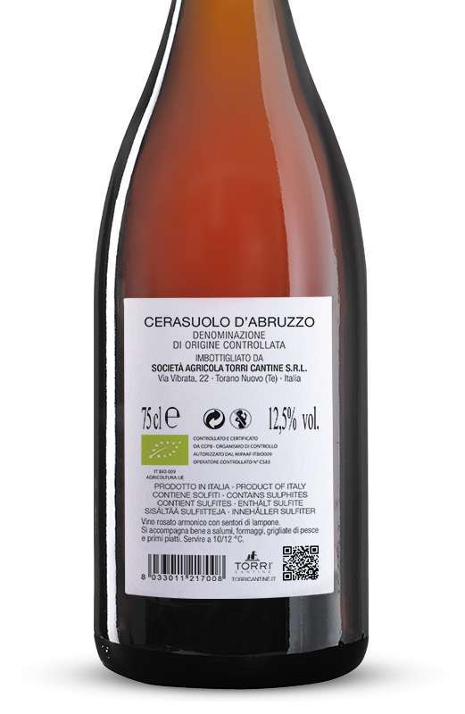 The Cerasuolo d’Abruzzo DOC grows between the mountains and the sea, in Controguerra, in the province of Teramo, in an evocative thirty-year-old row of vines at an altitude of 290 meters above sea level and magnificently exposed to the south-south-east.