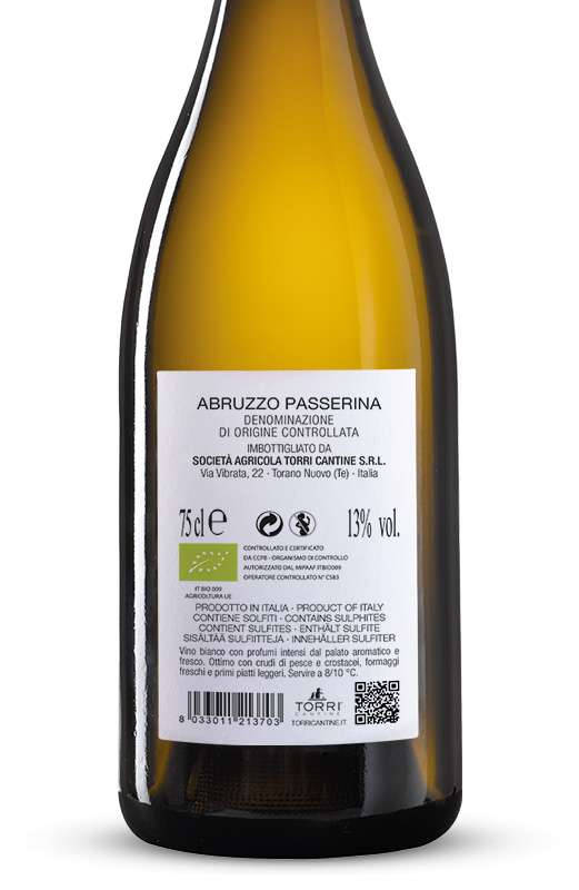 The strictly manual harvest occurs in the second ten days of September from certified organic cultivation. The vinification takes place in thermo-conditioned steel vats while the 4-months aging occurs in cement tanks before being bottled in the total absence of oxygen.