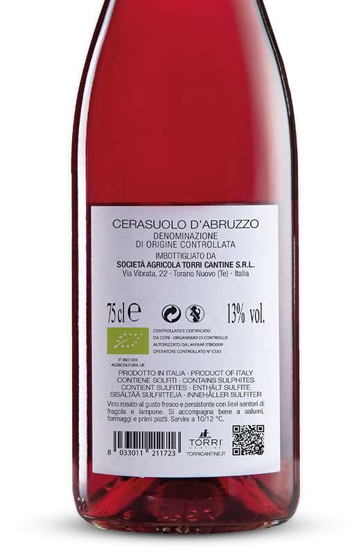 A Cerasuolo from Red grape varieties, obtained from a harvest in the second ten days of September, strictly manual, from certified organic agriculture, which ensures maximum respect for the surrounding environment.